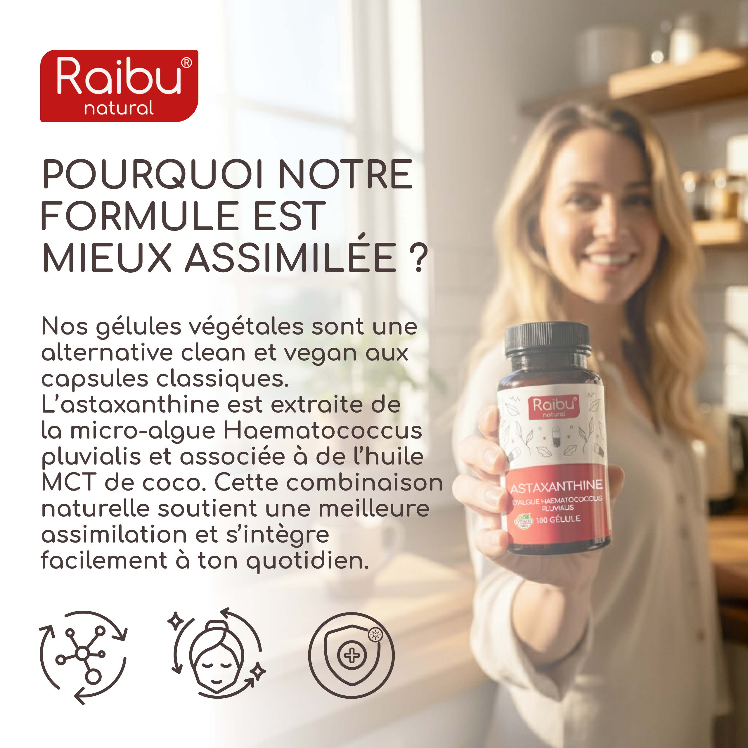 Astaxanthin is a potent antioxidant that protects your cells from daily oxidative stress. Sourced from red microalgae, it supports skin, eyes, and overall vitality — all in one simple daily capsule.